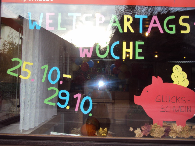 Letzte Woche war es wieder so weit. Die letzten Tage im Oktober standen vor der Tür und dies bedeutete zugleich, dass der Startschuss für die WELTSPARWOCHE 2010 gefallen war. Unsere Geschäftsstellen waren schön dekoriert und unsere kleinen Kunden bekamen ihren eigenen Schalter, wo wir uns nur auf sie konzentrierten. Auch wir Mitarbeiter freuten uns auf die strahlenden Kinderaugen.