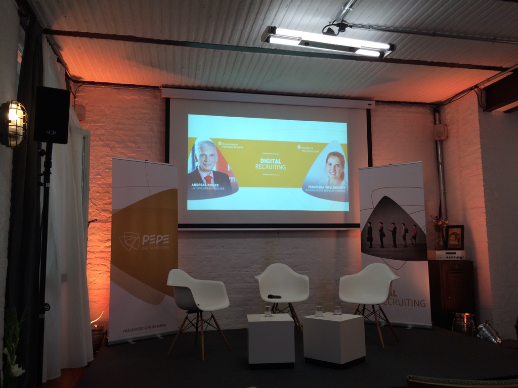 Zunächst stellte unser Mitstreiter, ein Vertreter der Sparkasse Dresden, sein Projekt vor. Je länger ich auf meinem weißen Stuhl saß und das zuhörende Publikum beobachtete, umso ruhiger wurde ich. Mit jeder Frage, die mir gestellt wurde, sank meine Aufregung und stieg meine Freude, hier dabei zu sein. Wir sprachen eine Stunde lang über das Thema, wie Kreditinstitute potenzielle Auszubildende online für sich begeistern können.